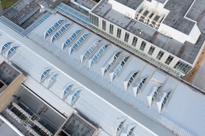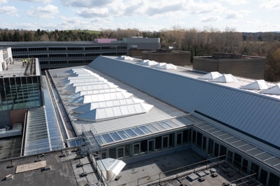 18 months prior to installation, Dan Crowley undertook a series of meticulous site surveys and condition reports. Working in collaboration with Architects, Pozzoni Architecture Limited and BDP Limited, they designed and specified the standing seam roof system to create the central atrium, the new-build roof on the gym and the refurbished existing flat roof sections.