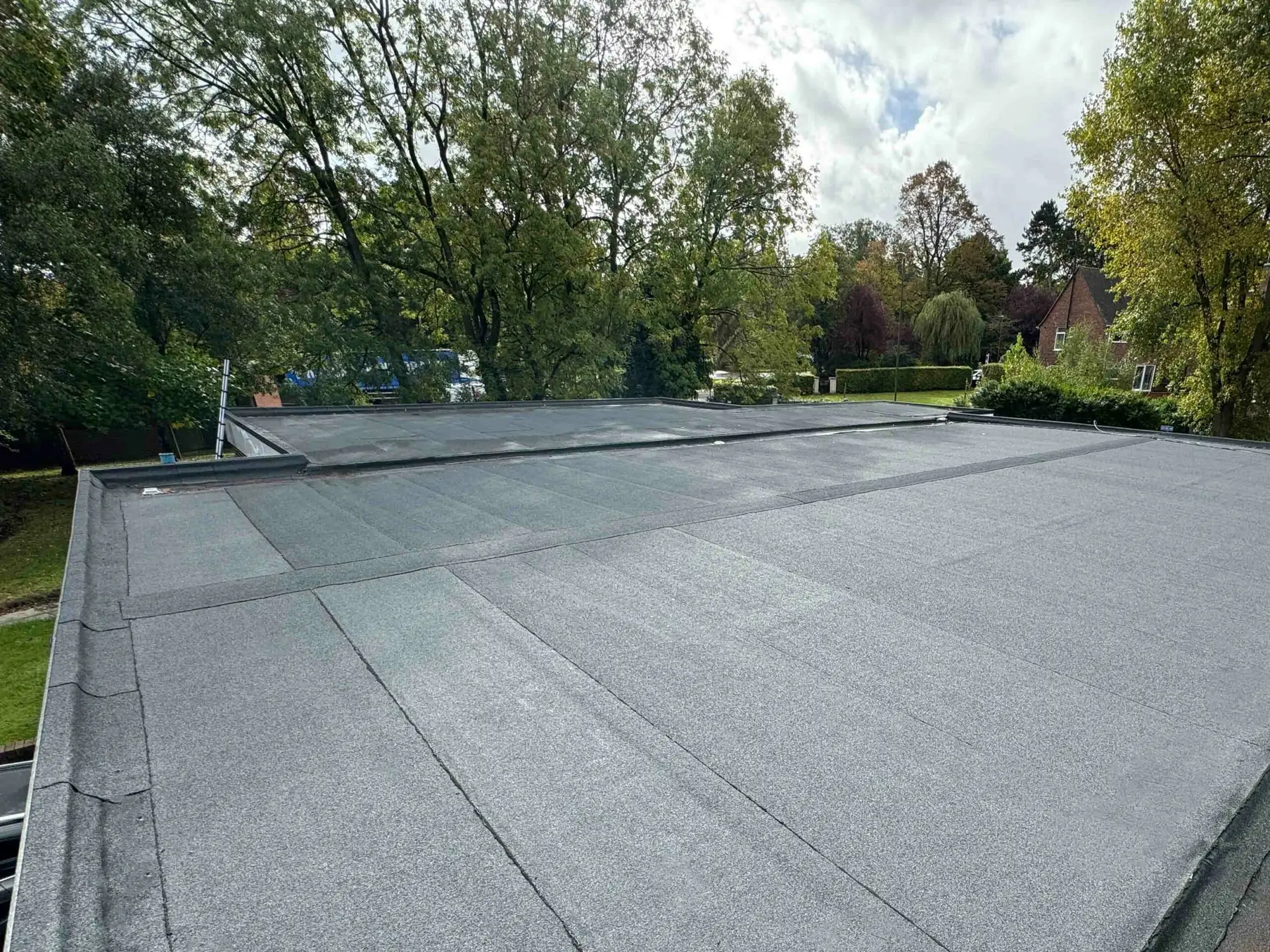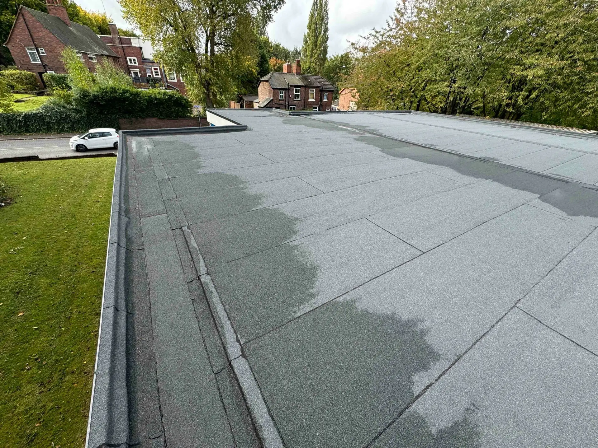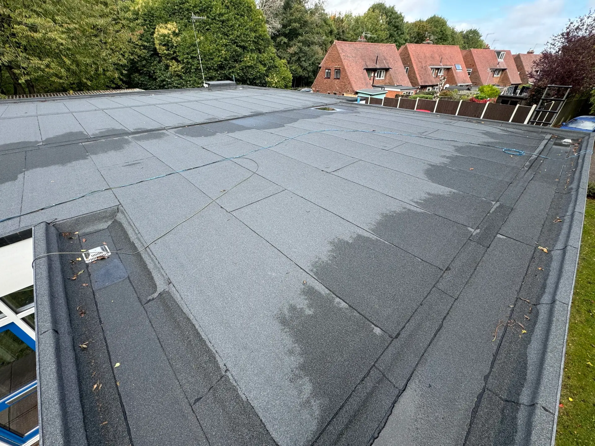 NRA Roofing began by removing the existing waterproofing down to the deck and installing a vapour control layer. The introduction of 180mm PIR insulation significantly improved the building’s thermal efficiency, while the StressPly Flex Plus mineral cap sheet provided robust protection against the elements.