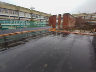To address thermal performance, a combination of flat board and tapered PIR insulation was installed to achieve 0.18 W/m2k, enhancing energy efficiency and aligning with the University’s sustainability goals. The Torch Ultra-Vent Base layer was applied over the insulation as a durable foundation for the final waterproofing.