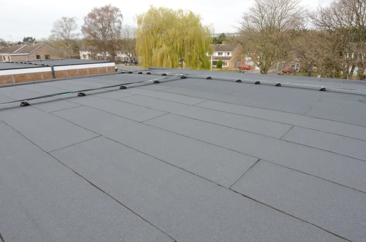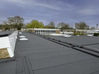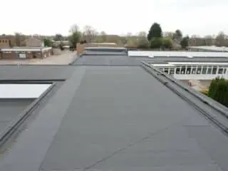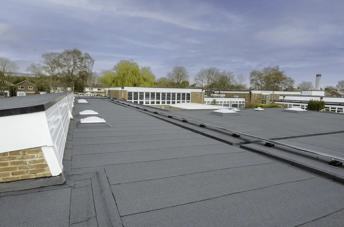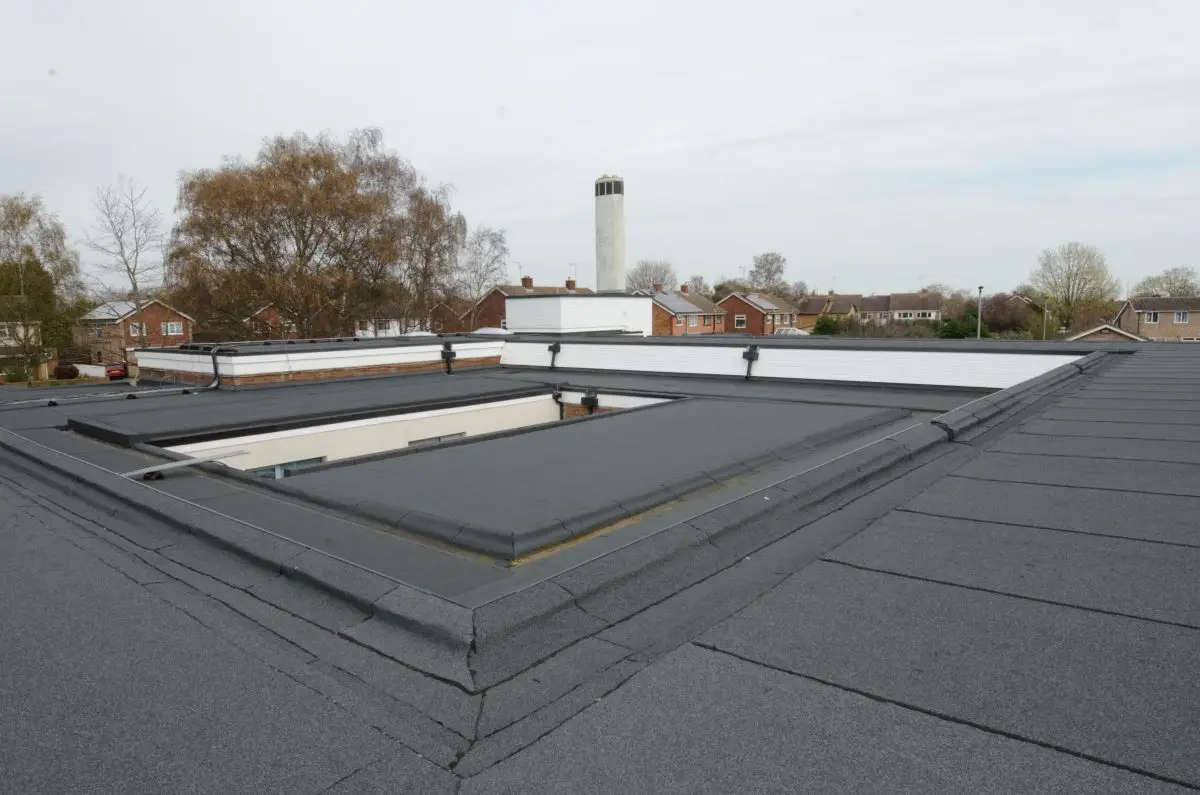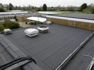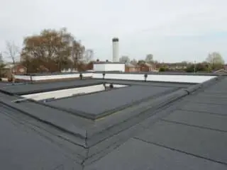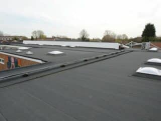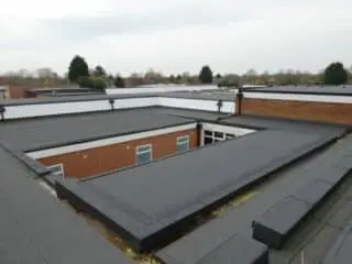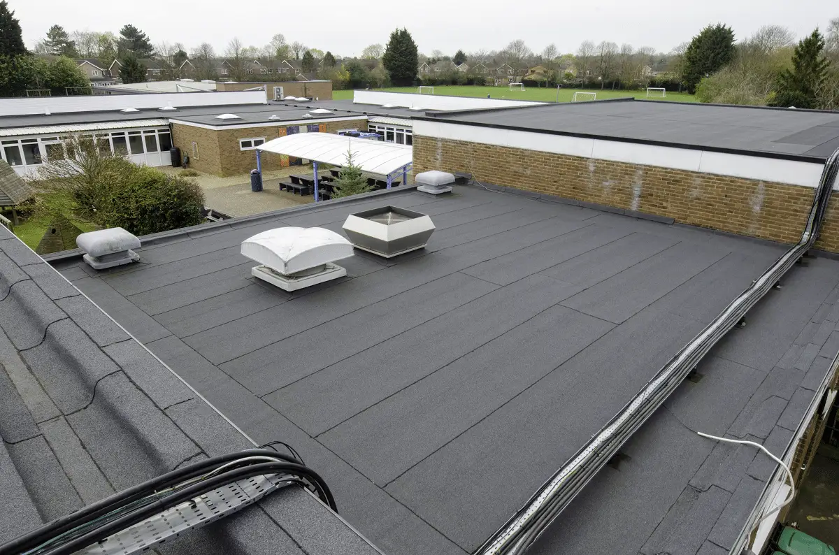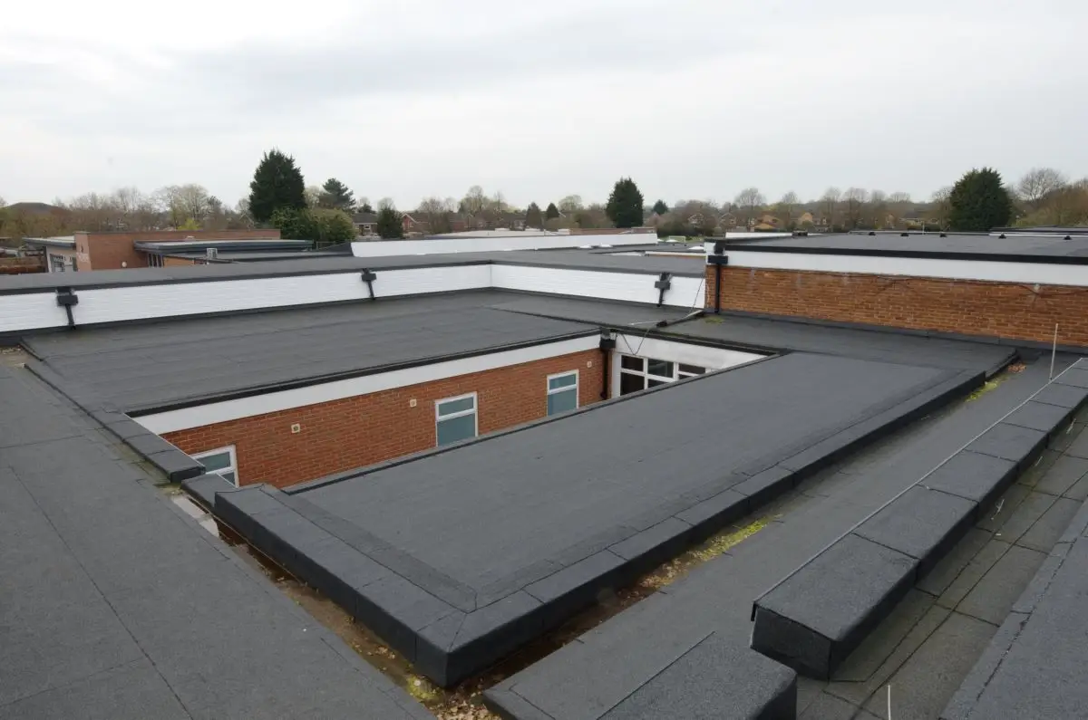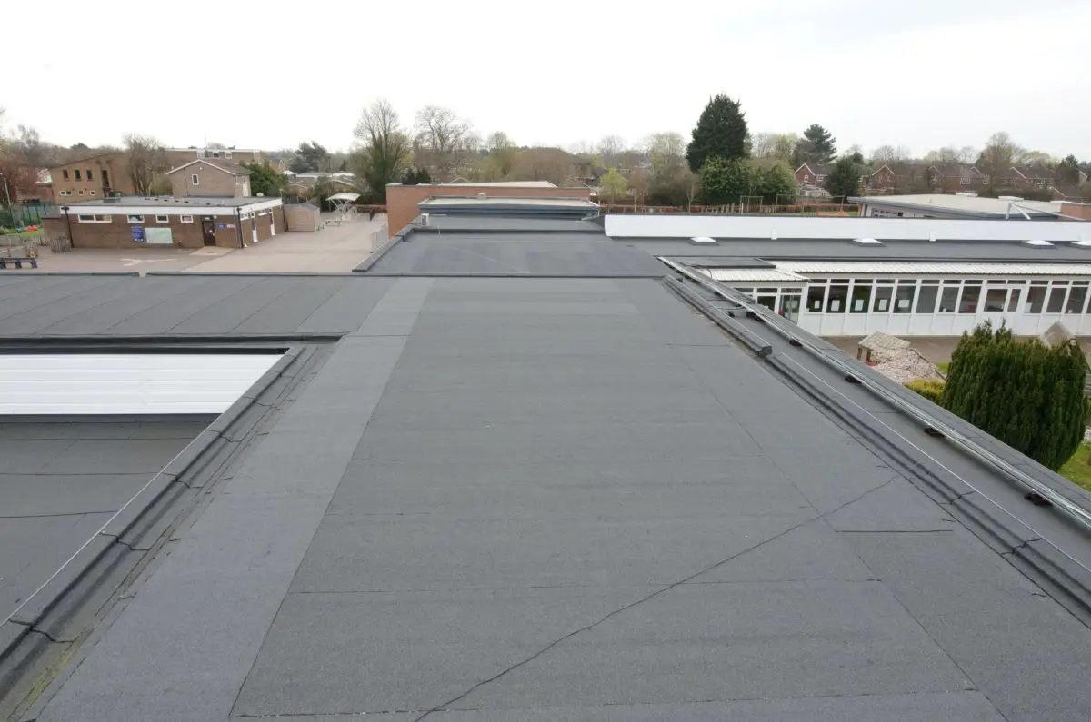 The existing roof build-up consisted of approx 35mm PUR insulation, which was insufficient to meet the thermal efficiency needs of the school and building regulations. A warm roof design utilising the BBA-certified StressPly Flex Plus system was specified for its superior tensile strength, allowing thermal movement without the risks of breaks in the membrane.