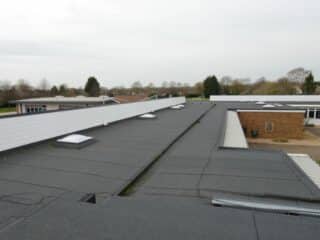 Approved Contractor NRA Roofing began the 3000 sqm roof refurbishment by isolating the wet roof areas and stripping this back before reinstating the roof to existing levels. The roofs were overlaid with new cut to falls insulation to provide a significant thermal upgrade to the school and eradicate the existing standing water issues.
