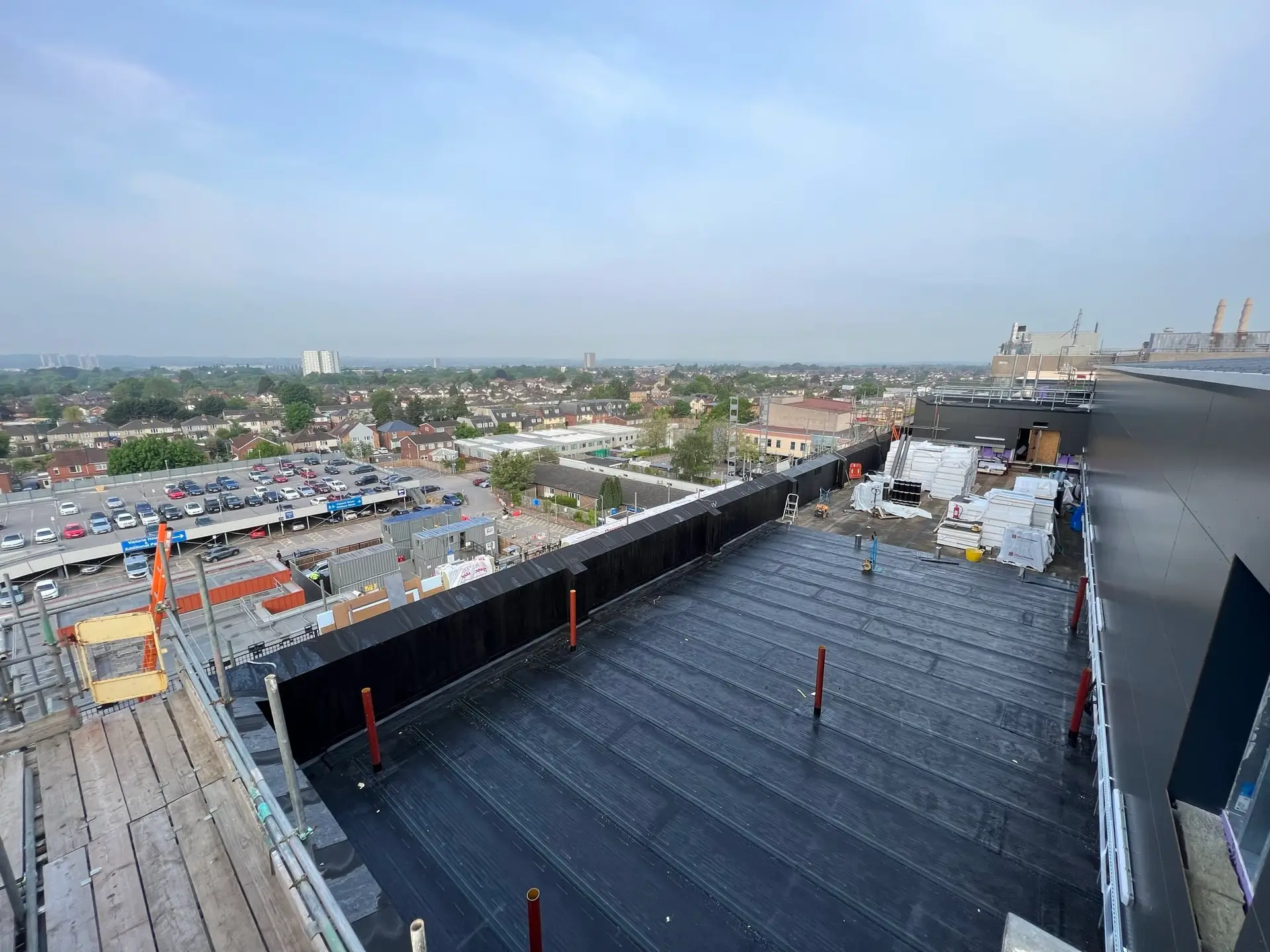 The roof construction comprised a new metal and timber framework, with a self-adhesive base sheet used for the parapet upstands. A self-adhesive vapour control layer was installed on the main roof areas to mitigate the risk of hot works on site with flammable materials, particularly for the initial waterproofing phase. The new parapet wall height negates the need for any additional handrails to conform to regulations.