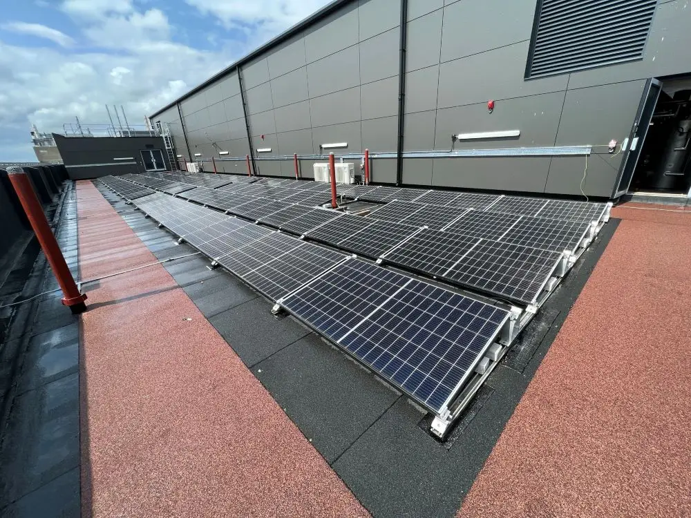 Once the warm roof system was in place, the existing solar PV array was reinstalled with a ballasted frame to ensure the waterproofing integrity was not compromised with penetrations to the roof system. Ballasted frames are load-supported and can be used with existing PV panels, creating flexibility for new and pre-owned systems.